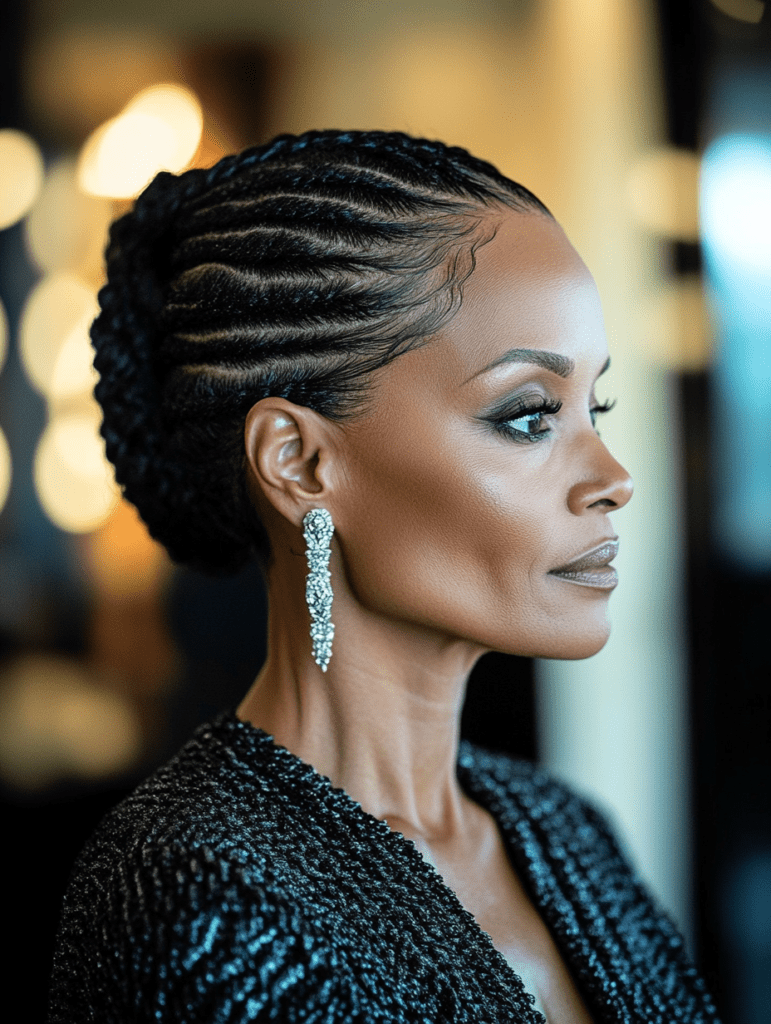 This classic style involves neatly braided cornrows that are gathered into a bun at the crown or nape of the neck.
