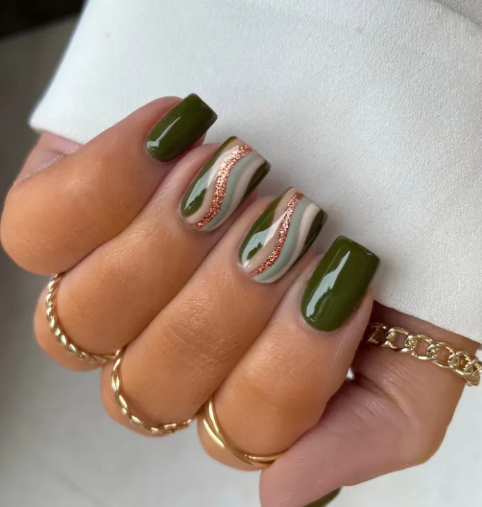 These olive green nails bring that grounded autumn energy, while the wavy accents add a soft, artsy twist. It’s the perfect earthy manicure for slow walks under golden trees or sipping something warm by the window.